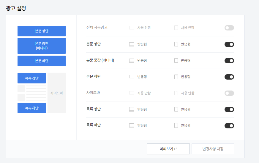 저는 기본적으로 아래와 같이 자동광고를 설정했습니다.