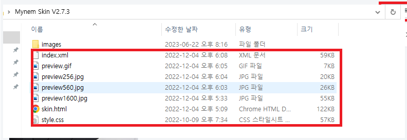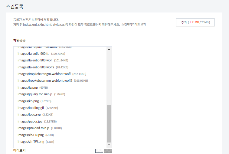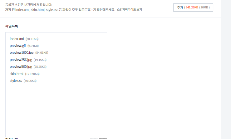 2. 2번에 나누어서 스킨을 등록할 것입니다. 첫번째는 이미지를 제외한 파일들을 먼저 등록해줍니다.