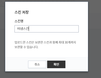 모두 등록이 된 것을 확인하면 하단 [저장]을 클릭하고 구분가는 스킨명을 써줍니다.